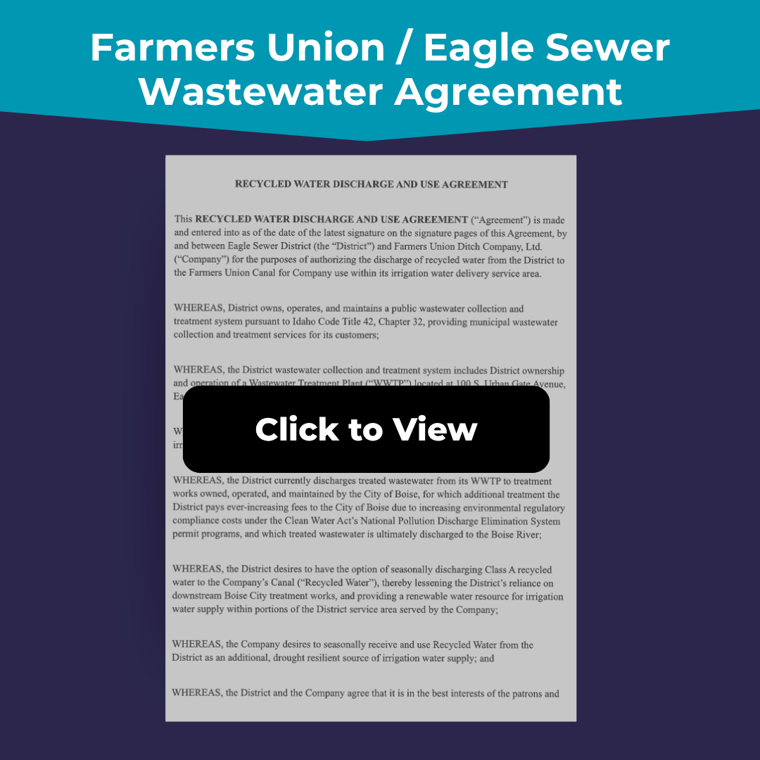 In October 2024, Farmers Union Ditch Company signed an agreement with Eagle Sewer District (ESD) to discharge Class A treated municipal sewer water into the canal system.